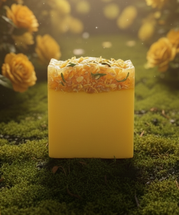 This handcrafted Marigold Natural Soap is a gentle, nourishing treat for the skin, enriched with the soothing and healing properties of marigold petals. Infused with natural oils and marigold extract, it cleanses while calming irritation, reducing redness, and supporting skin regeneration. Its creamy lather leaves skin soft, smooth, and revitalized, while the subtle floral aroma adds a refreshing and uplifting touch to your daily bath ritual. Made in small batches with care, this artisanal soap combines natural beauty and gentle skincare for a truly luxurious experience. Net: 110g